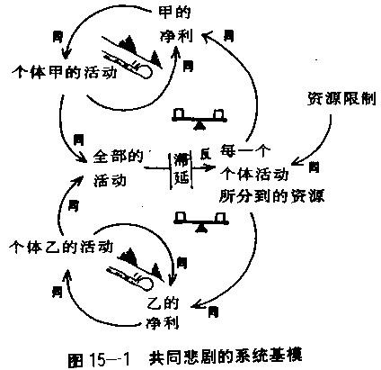 这个基模的类属形式如图15—1所示。个体甲及乙只专注于自己的需要,而非整体的需要。短期内,个体经由自利的行动而获利,获利导致更多活动,进而获利更多,而形成图中的那些增强环路。牧人因畜养更多的牲口,增加了财富,因此又鼓励他们畜养更多的牲口。但是,所有个体为了本身的利益(图中显示的只是两个个体的增强环路,实际上可能有数百或数千个个体局部决策者)所采取的行动总和,形成一个有自己生命的“总活动”。终于(时间滞延可能有好几年),每一个个体活动的获利(每头牲口之获利)开始衰退,每一个个体的利润开始逆转。等到他们体认到共同错误的严重性时,要拯救整体已经太迟了,接着所有的个体都跟着完蛋。只有个别个体看出问题是不够的;问题仍是无法解决,除非大多数决策者为了整体的利益而一起行动。