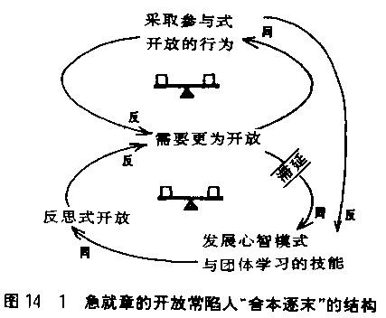 但是这些技能的培养需要时间与毅力,大多数的管理者却完全未认识这点,而常形成“舍本逐末”的结构。当我们觉得需要更加开放时,常常采取参与式开放的行为:更加坦率地表达我们的看法、请求他人提供意见、加强和每一个人谈论我们的问题等。而这些急就章的行为,会使参与式开放成为一种症状解;这使得根本解在舍本逐末的结构中被取代了。这些根本解包括培养探询、反思和深度汇谈的技能,如图14—l所示。