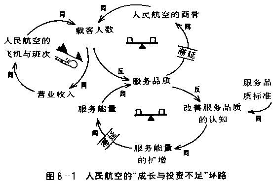 图8—l显示了人民航空“成长与投资不足”的基模。(此基模与前章中“成长上限”、“舍本逐末”两个基模,同收录于第六章附录的九项基模中。)