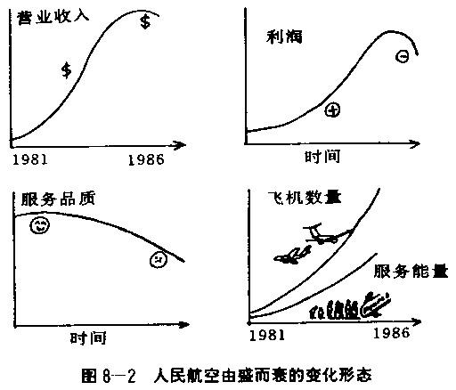 人民航空公司虽然产生快速成长的结构,也同样产生快速衰败的结果。由图8—2所示其五年期间的表现,便可看出它成K和衰败的变化形态;销售和营业收入迅速成长,然后慢下来,最后没落;利润上扬,然后滑落,变成巨额亏损;服务品质在开始的时候很高,然后持续恶化;飞机的数目迅速增加,服务人员的数目也在成长,但是服务能量无法赶上乘客人数的成长。