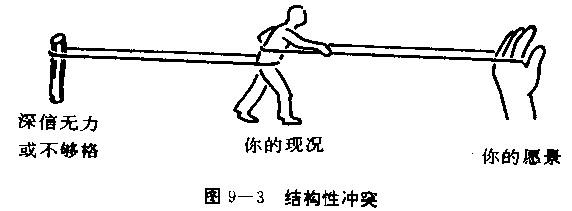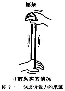 弗利慈使用一个隐喻,描述潜在矛盾如何发生结构性的作用,使我们与目标背道而驰(图9—3)。假想你向着自己的目标移动,有一根橡皮筋象征创造性张力,把你拉向想要去的方向,但是也想象还有第二根橡皮筋,被无力感或不够格的信念拉住。当第一根橡皮筋把你拉向目标,第二根橡皮筋把你拉回你不能(或不够格)得到这个目标的潜在想法。弗利慈称这种系统为“结构性冲突”(structuralconflict),它是一个各方力量互相冲突的结构,同时把我们拉向和拉离所想要的。