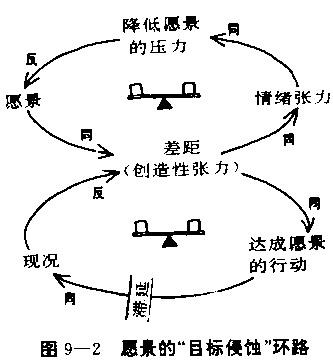 在第七章与第八章中,情绪张力是侵蚀神奇科技与人民航空目标的肇因。创造性张力与情绪张力的互动是一种“目标侵蚀”的环路,如图9—2所示。