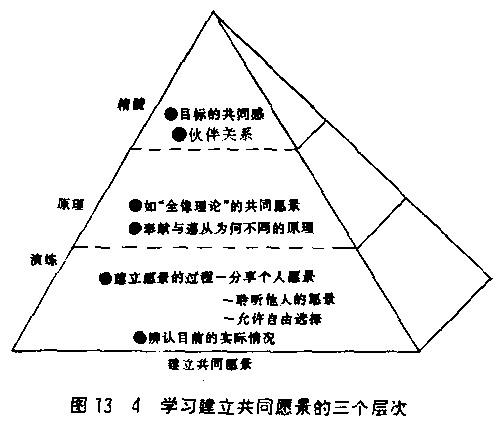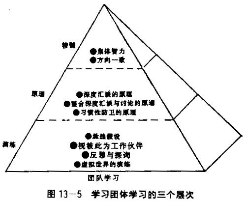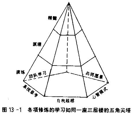 五项修炼的学习就像一座三层楼的五角尖塔,其中每一项均可由三个不同层次来看,如图13—1所示: