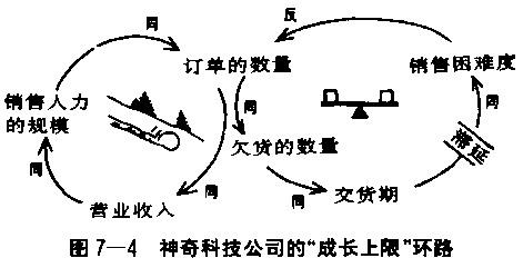 任何成长上限结构的另一个部分,自然是一个“调节环路”。必定有某种使销售慢下来的原因。但是销售只有当市场饱和、竞争升高,或顾客不再需要更好的产 品时才会慢下来。在这个实例中,市场对神奇科技公司电脑的需求仍然强劲,而且并没有重大的竞争对手。一个把客户吓跑的因素是:交货期太长了。当积欠的订单 超过产能愈多时,交货期愈被拉长。交货服务不佳的声名渐渐形成,终于使销售人员愈来愈难提高销售。“成长上限”的结构看起来如图7—4所示。