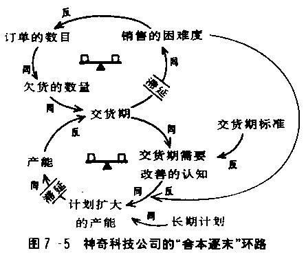 这家公司在当时,没有人认识到还有另一个系统基模也在其中运作;那便是“舍本逐末”的结构。该公司有一个持续恶化的问题症结存在,即交货期延 长。虽然仍有几次周期性的交货期改善,但是整体公司体质仍持续恶化。如果要从系统思考的方法着手,你首先要找出关键性的问题症状,然后找出它的症状解与根 本解。在这个实例中(见图7—5),根本解(图中位于下方的环)是以扩充产能来控制交货期:当交货期超过标准,表示需要等到产能扩大到足够的程度,交货延 期的问题才能获得改善。但是如果此一根本解的效果来得较慢,太长的交货期造成客户不满,订单减少的结果,使得管理者改采症状解(图中位于上方的环)。由于 管理者未能以足够快的速度扩大产能,来解决延迟交货的问题,而丧失了许多准客户。