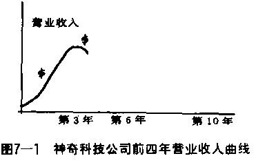 尽管他们做了这么大的努力,第三年结束的时候,销售仍开始下跌。到了第四年,销售业绩下降到了危机的边缘。那时的营业收入曲线看起来如图7—1所呈现的。