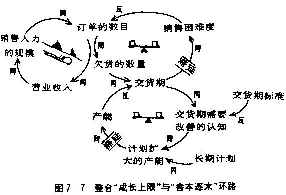 如图所示,这两种结构有部分重叠,共有一个调节环路——不满意的客户因交货期延长而减少订单。该调节环路分散了对扩大产能的注意力(“舍本逐末”), 也使销售无法扩大(“成长上限”)。是否“不满意的客户”这个环路会变成主导环路,端视公司如何处理交货延期事件而定。如果未能严守交货期的标准,公司会 渐渐“舍本”而“逐末”。换句话说,公司不知不觉中“染上限制自己成长的瘾”。