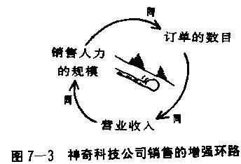 有许多可能的“增强环路”都会造成初期快速的销售成长。例如对产品研发及广告的投资,以及良好口碑的建立等,都会不断扩大成功的效果。我们在 神奇科技公司的故事中,就可以看出,把收益投资在增加销售的人力以创造业绩,会形成这种增强环路:更好的销售业绩产生更多的收益,进而雇用更多的销售人 员,如图7—3所示。