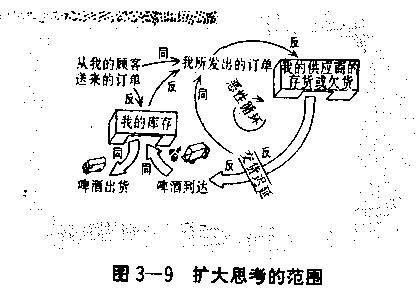 要改善啤酒游戏的绩效,参加的人必须扩大思考的范围,如图3—9的白色部分所示。在任何一个位置上的人的影响,都会超出自己位置的范围以外。例如当你发出订单时,供应商送啤酒来,所以你的订单影响供应商的行为,接着他的行为还会影响另外一个供应商的行为。其次,你的成功不仅受到你所下订单的影响,也受到系统里面其他每个人的行动的影响。譬如,如果制造商的啤酒没货了,很快的其他每一个人也都将没有货。大的系统顺利运作,每个部分才能顺利运作。在啤酒游戏以及许多其他的系统中,自己若想成功,必须其他人能成功。此外,每位参加游戏的人必须有此共识。因为,如果任何一位参加游戏的人产生恐慌,而发出一张大订单,恐慌便会透过系统而愈演愈烈。