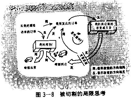 局限思考的典型疏失,在于误认为自己订单与他人订单的互动方式,所影响的变数是“外部的”。绝大多数人对于自己是较大系统内一部分的这个事实,认知非常模糊。譬如,他们并未想到自己发出的大订单,会把供应商的库存吸得精光,因而造成供应商交货更加迟延。他们更没想到,如果接下来以发出更大的订单以应付交货迟延,将导致一个恶性循环,加重整个系统的问题。
