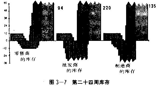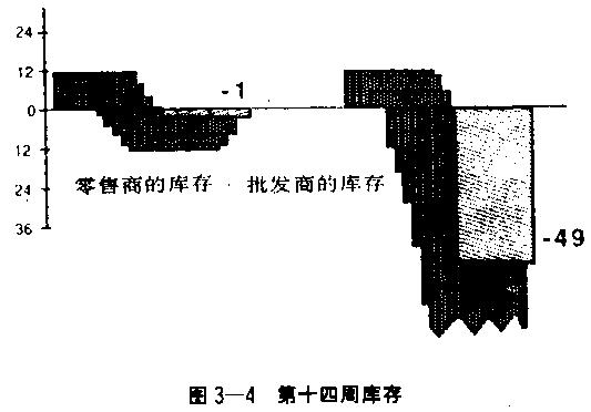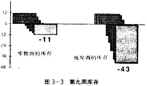 游戏中另一项值得注意的行为变化形态,可以由库存与欠货数量中观察到。零售商的库存大约从第五周开始降到零以下。零售商的欠货数量在继续增加了几周之后,它的库存在第十二周到第十五周还是未能回到正数。同样的,批发商的欠货情形大约从第七周开始,持续到第十七周左右;制造商的欠货情形大约从第九周开始,持续到第十九周左右。然而一旦库存开始又有存货,它的数量便开始激增(在第三十周,零售商大约为40,批发商大约为80到120,制造商大约为60到80),远高于所期望的量。所以每一个角色都经历“欠货——存货”的循环:先是库存不足,然后库存过多。